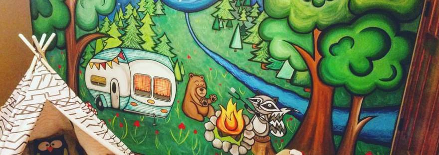 It’s the painting I did for Everett’s camping theme bedroom. I got this scene idea from Everett’s favorite book, The Brave Little Camper that we purchased from Target. It even has a button that you can press to make sounds of the night. He just loves this book and he tries to mimic the sounds. My favorite is when he howls like the owl.