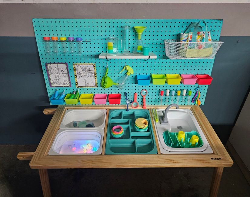- Beright Sink and 1 storage bin $39.00: Beright brand sink from Amazon *Note in my photo I inserted my Lovevery brand sink. This can only be purchased through a subscription on the Lovevery website or some sell it second hand on Facebook marketplace. I decided to stick with the Lovevery sink since much of my toys match the table well.