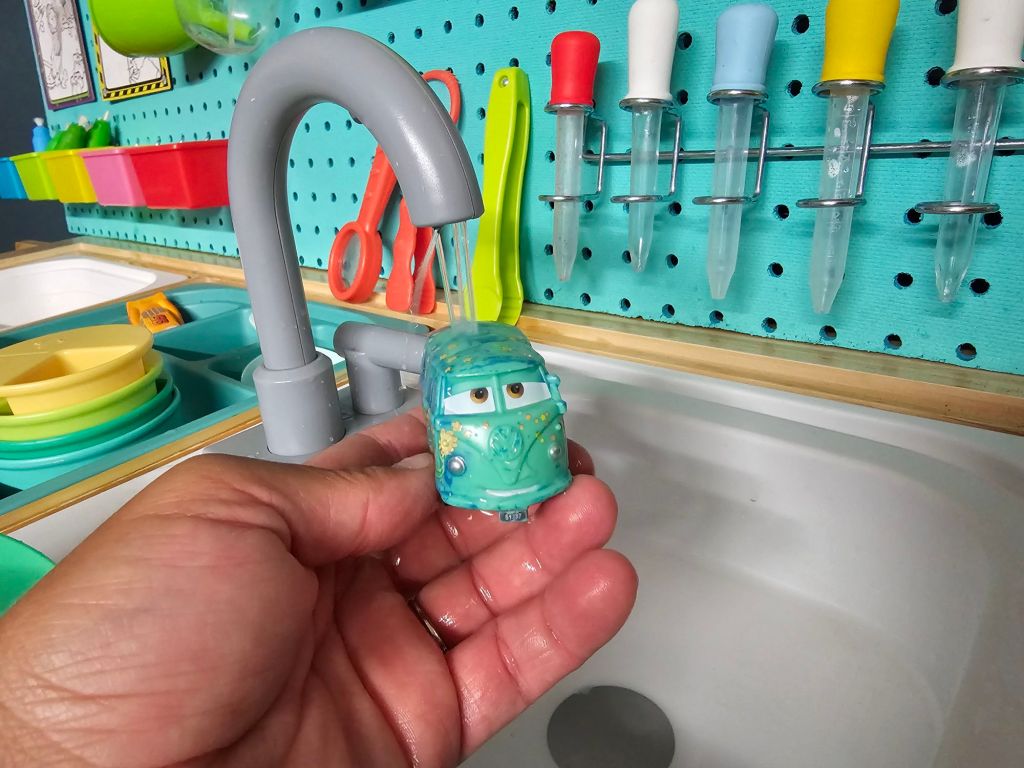 I added a 14 x 14 whiteboard that is magnetic. This works great to attach our water wow book pages. Attached them to the magnetic whiteboard and color with water. I also just set out regular paint brushes instead of the fancy plastic one it comes with. They can just dip their brush straight in the water and paint more naturally. I also bought color changing Disney Cars. We fill up one section of very warm water. Then we fill up the sink with extremely cold water. You can add ice in the bin or put cold packs in.
