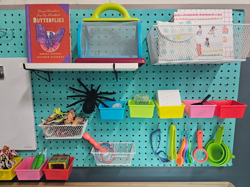 I’m going to share with you my basic set up, where to purchase much of the core items. Then I’ll break down what I bought for my water table/science experiment lab. First thing you will need to do is buy regular pegboard material from Home Depot or Menards and cut it to size. This measures 46 by 24 inches. Then you can spray paint it or use acrylic paint. If you plan to spray with spray paint, you will need two coats which will equal about 2 cans. I also recommend a clear polyuethane top coat to protect it from water.